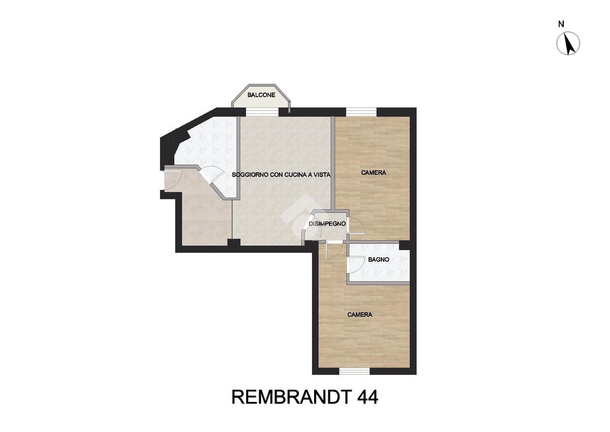 Ad. MM Gambara, via Rembrandt. Stabile civile con ascensore, riscaldamento centralizzato e piccolo giardino condominiale. Appartamento al primo piano composto da ingresso, soggiorno con cucina a vista e balcone, due camere matrimoniali, due bagni completi di cui uno finestrato, ripostiglio aereo e solaio.